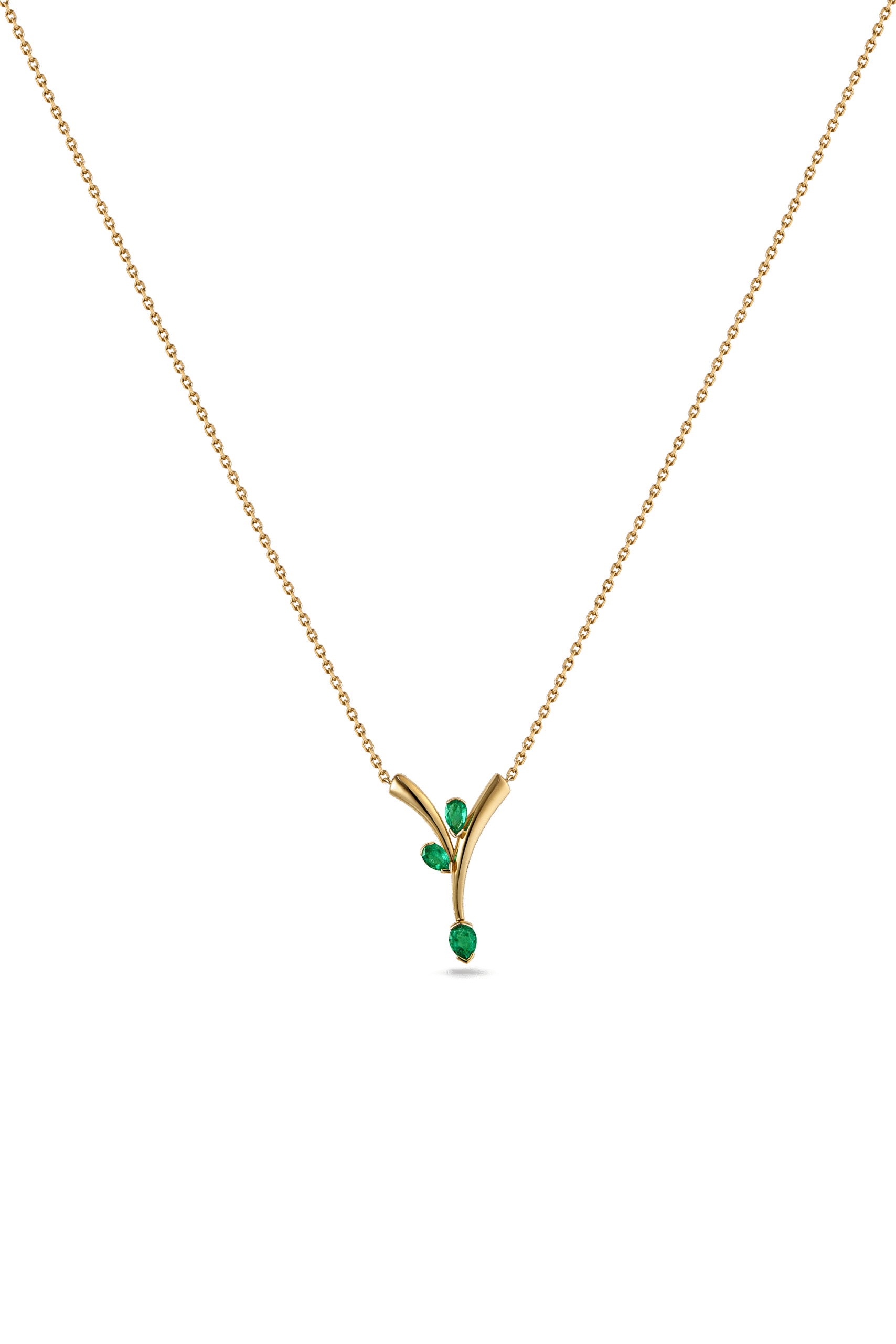 Intersect Pendant- in yellow gold, set with pear-shaped emeralds.